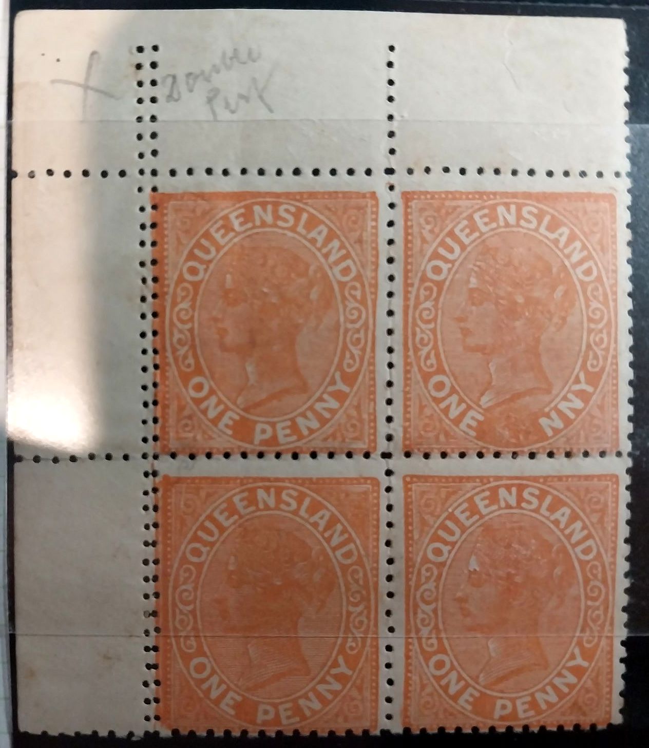 Ken Scudder (Queensland Postage Stamps 1879 to 1912, p. 170), provides additional information. "Initially this bubble of ink sat upon the tops of the "PE" but soon worked down to obliterate these two letters. Curiously, this flaw is known on stamps of both Red-Orange and Pale Yellow-Orange. As the flaw was transient, it would seem that the changes in colour may have, to some extent, been random. It is believed the air bubble came about when a new inking roller was used for the first time."